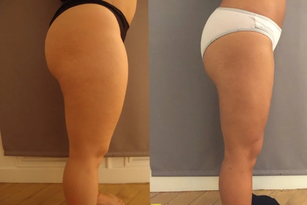 Trois mois après la liposuccion qui a permis le retrait de 1200 cc de graisse par cuisse, cette jeune patiente a perdu 5 cm de tour de cuisse et 5 kilos.